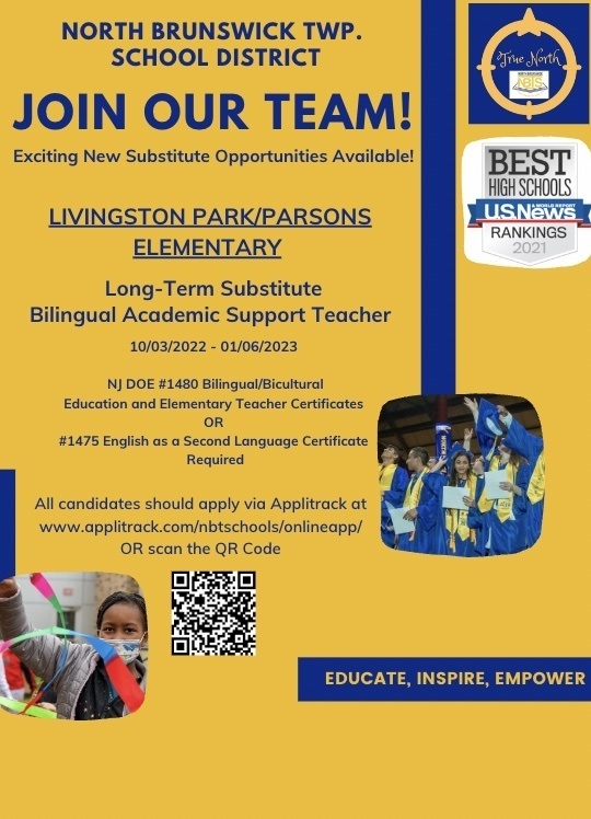 EXCITING LONG-TERM SUBSTITUTE TEACHER OPPORTUNITIES FOR THE 2023-24 SCHOOL YEAR (PRE-K, ELEM, MIDDLE SCHOOL & HIGH SCHOOL) - JOIN OUR DYNAMIC TEAM! Apply now at www.applitrack.com/nbtschools/onlineapp